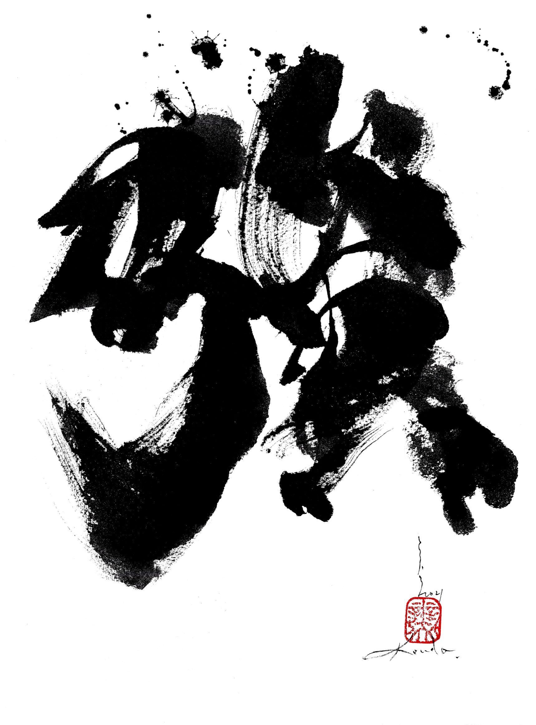 Net als de krachtige staccato klankkleur van het Japans, ontbolstert haar virtuoze ‘Sumi’-inktstaaf techniek de samengebalde energie van de kanji ideogrammen.